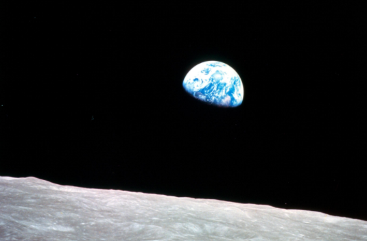 AS08-14-2383 (21713574299), from which Earthrise was cropped. The photo is displayed here in its original orientation as seen by the crew of Apollo 8. Lunar north is up.[10]